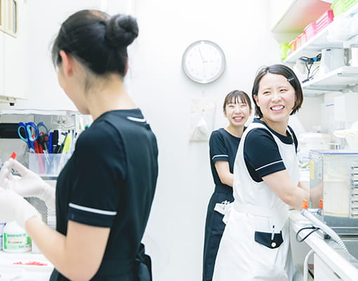 ONの時は皆、緊張感をもって仕事に取り組み、真剣に患者様と向き合っています。OFFの時は雑談などで笑いあったり、お土産を交換しあったりと和気あいあいな雰囲気です。